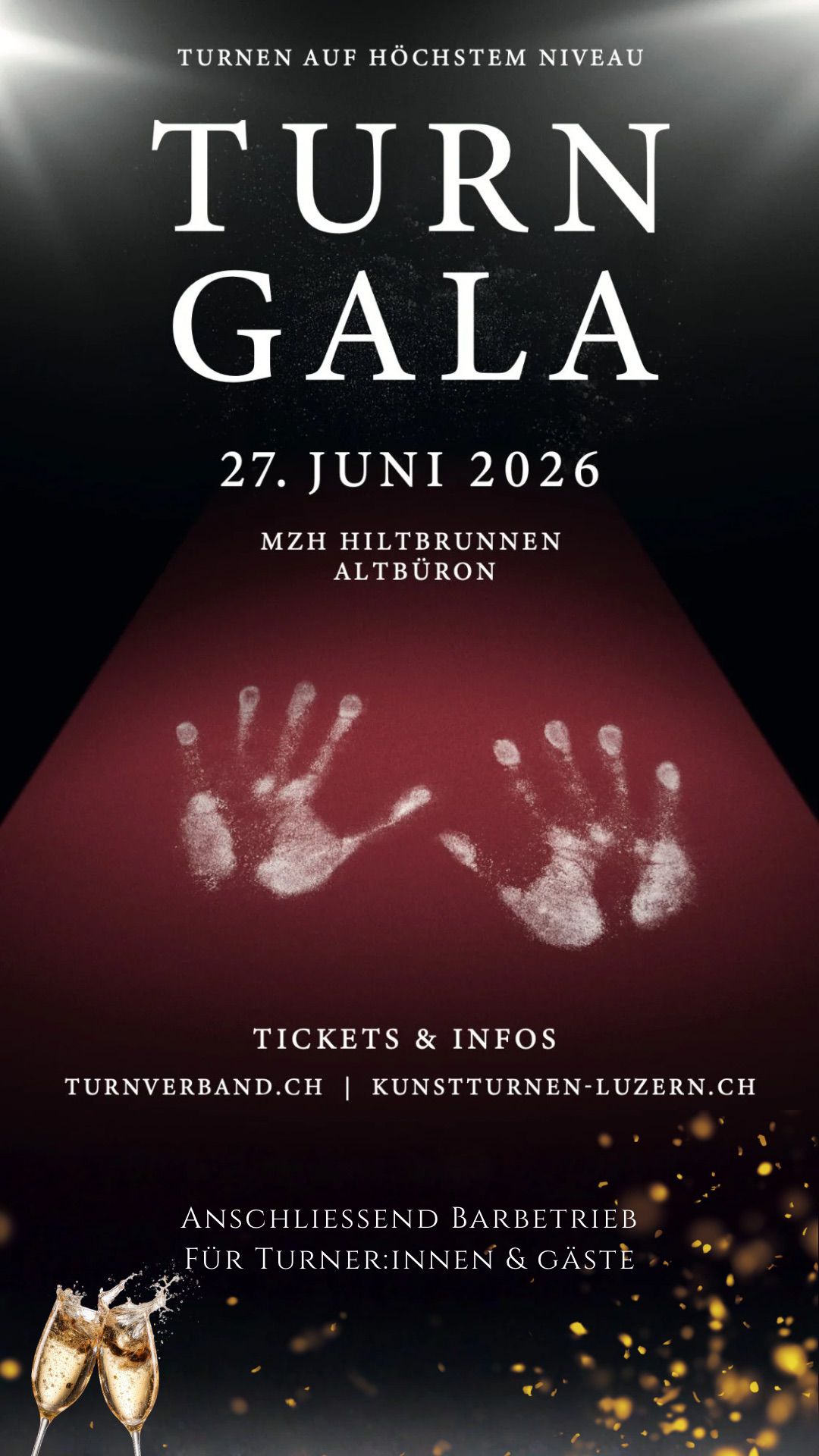 Wir freuen uns am Samstag 27. Juni 2026 zusammen mit dir einen unvergesslichen Abend – die TURN GALA – erleben zu dürfen. Es erwartet dich ein Turnspektakel auf höchstem Niveau. Die erfolgreichsten Vereine und herausragendsten Einzelturner*innen aus dem Verbandsgebiet Luzern, Ob- und Nidwalden vereint in einer Halle. Präsentiert werden Disziplinen aus dem Geräteturnen, dem Kunstturnen und dem Vereinsturnen. Kompakt, mitreissend, grossartig.